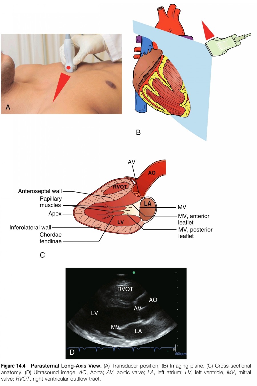 PLAX를 얻기 위해서는 transducer orientation marker를 환자의 right shoulder로 향하게 한다(figure 14.4). Ultrasound beam은 환자의 right shoulder에서 left hip에 이르는 line에 평행하게 위치시킴으로써, cardiac apex에서 base에 이르는 long axis에 해당하는 anatomic cross section의 image를 얻을 수 있다.