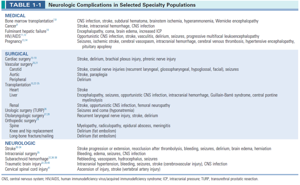 Neurologic complication은 invasive procedure와 therapeutic intervention 시행 후 나타날 수도 있다. 일반적으로 ICU에서 시행하는 치료(eg, intubation, drugs)로 인해 physical examination이 제한되는 경우 임상 양상이 혼동되는 경우가 흔하기 때문에 neurologic complication의 확인이 지연되거나 혹은 완전히 놓칠 수 있으며, 발병을 감지하는 sensitive method가 없어서(eg, delirium) 진단에 어려움을 겪는 경우도 있다. Neurologic complication이 발생한 환자의 morbidity와 mortality가 증가한다고 알려져 있다; 따라서 intensivist(중환자 전담의)는 중환자를 진료할 때 neurologic status 변화에 주의를 기울여야 한다.