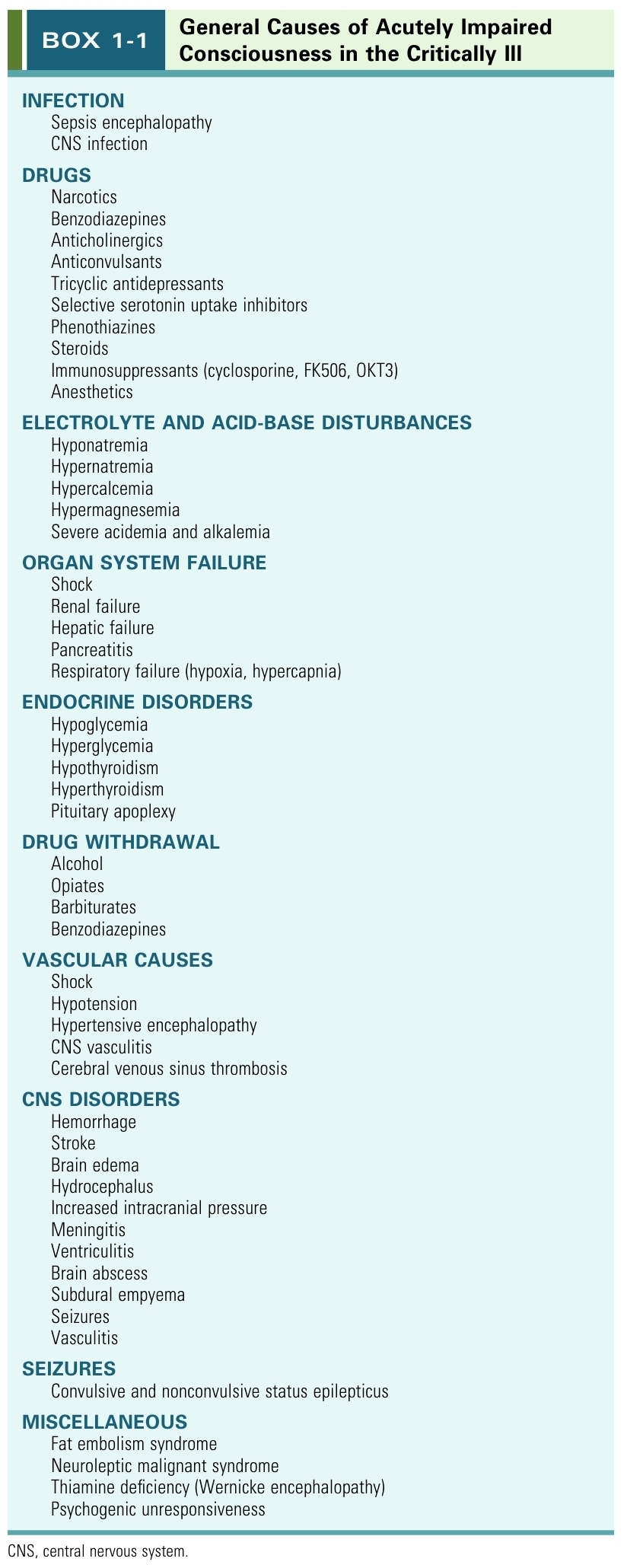 중환자에서 급격한 의식변화가 발생한다면 반드시 원인에 대한 평가를 시작해야 하며, 환자의 나이와 장기부전의 존재 유무, metabolic status, medication list, 그리고 감염의 유무를 확인해야 한다. Primary CNS disorder 환자에서 발생하는 의식변화(e.g., from stupor to coma)는 brain edema, intracranial pressure 상승, intracranial hemorrhage의 발생이나 악화, hydrocephalus, CNS infection, cerebral vasospasm가 원인일 수 있다. Primary CNS disorder가 없던 환자에서는 infectious complications(i.e., sepsis-associated encephalopathy), drug intoxication, 장기부전 발생이나 악화로 나타날 수 있다. 최근에는 nonconvulsive status epilepticus(비경련 간질 중첩증)가 중환자에서 발생하는 의식 장애의 원인으로 주목받고 있다.