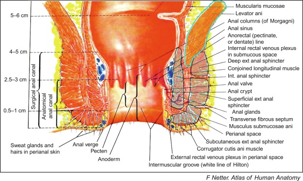 항문관의 내막은 상부의 mucosal segment와 하부의 cutaneous segment로 구성되어 있다. Dentate line은 외배엽과 내배엽이 '톱니모양으로' 만난 접합부이며 따라서 두 가지 다른 기원의 정맥과 림프 배액, 신경 지배 및 상피세포 간의 중요한 지표가 된다. dentate line 상부의 대장은 sympathetic nerve와 parasympathetic nerve의 지배를 받고 혈관과 림프는 hypogastric vessel관 연관되어 있다. 반면 dentate line 하부의 항문관에는 somatic nerve가 분포하고 혈관 분포는 inferior hemorrhoidal system과 관련이 있다.
