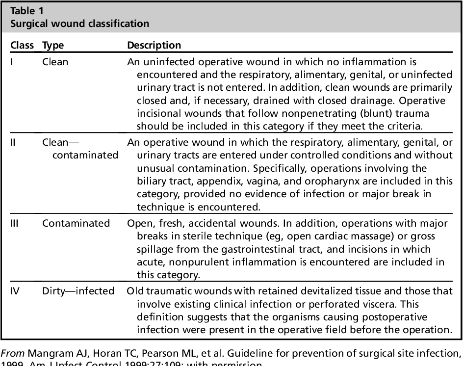 청결 창상(class I)은 감염이 없고 단지 피부의 미생물이 상처를 오염시킬 가능성이 있으나 미생물을 함유한 강동장기를 열지 않았을 때의 상태이며, 청결-오염 창상(class II)은 호흡기, 소화기, 비뇨생식기관과 같은 장관에서 내용물이 흘러나오지 않게 조심해서 열었을 때이다. 오염 창상(class III)은 손상 후 상처가 열린 상태로 다량의 세균들이 체내의 균이 없는 곳으로 흘러들어 가거나, 장 내용물이 다량으로 누출되었을 때 또는 염증이 있는 조직을 절개했을 때의 상태를 뜻한다. 불결 창상(class IV)은 치료가 지연된 외상에서 괴사조직이 있고 농양이 있는 감염 또는 장이 천공되어 고도의 감염이 있을 때를 의미한다.