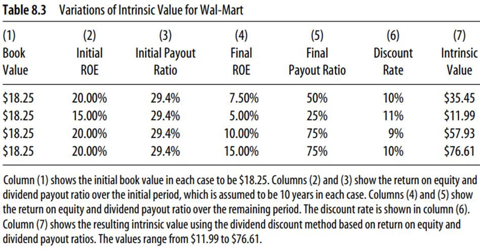 현금흐름법과 마찬가지로 배당할인모형의 모든 변형도 그 계산 결과가 불안정하다. 투입 변수 수치를 조금만 바꿔도 결과가 크게 달라진다. 아래 표에서 투입변수에 따라 내재가치 계산 결과가 매우 다른 것을 확인할 수 있다.
