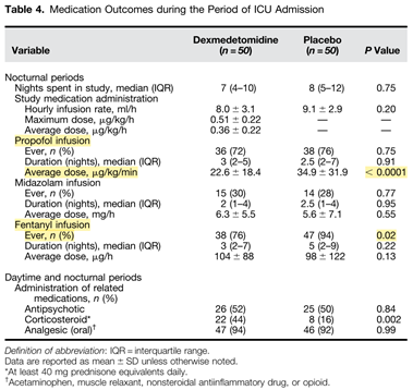 야간에 dexmedetomidine을 투여한 결과 placebo 군과 비교했을 때 중환자실 재실 기간 동안 섬망이 발생하는 경우가 더 적었다(dexmedetomidine [40 (80%) of 50 patients] vs. placebo [27 (54%) of 50 patients]; relative risk, 0.44; 95% confidence interval, 0.23–0.82; P = 0.006). Leeds Sleep Evaluation Questionnaire score는 양 군 간에 비슷하였다(mean difference, 0.02; 95% confidence interval, 0.42–1.92); dexmedetomidine 군 34명에서 환자당 평균 7회 평가, placebo 군 30명에서 환자당 평균 6회 평가. Hypotension, bradycardia가 나타나는 경우도 양 군 간에 유의한 차이가 없었다.