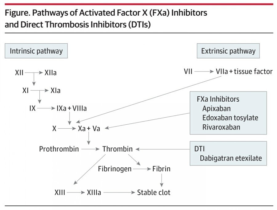 여러 대규모 RCT에서 NOACs는 AF-related thromboembolism과 venous thromboembolism의 예방에 있어서 warfarin sodium보다 효과가 낮지 않다(noninferior)고 발표하였다. Warfarin과 비교했을 때, NOACs는 gastriointestinal bleeding 위험이 높았지만, fatal bleeding과 intracranial hemorrhage 가능성은 더 낮았다.