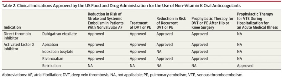 Non-vitamin K oral anticoagulants(NOACs)는 nonvalvular atrial fibrillation(AF) 환자에서 thromboembolism(혈전색전증)의 예방과, deep vein thrombosis(DVT, 심부정맥 혈전증)와 pulmonary embolism(PE, 폐색전증)의 치료나 예방을 위한 목적을 위해 복용하며, US FDA(Food and Drug Administration)으로부터 승인받은 약제다.