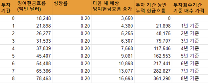 마스타카드(MA)를 예로 들면 위 그림과 같이 적정 매수 가격(시가총액)은 361,290 달러(단위 백만)다. 투자 회수 기간법은 8년 치의 누적 잉여현금흐름을 기준으로 한다. 8년을 기준으로 하는 근거는, 찰리 멍거는 비상장회사의 적정 가격은 같은 회사가 상장회사일 때 팔릴 가격의 절반 정도라고 보는 데 있다. 상장회사는 대개 12~20년 치, 평균적으로 16년 치 현금흐름에 해당하는 가격에 팔린다.