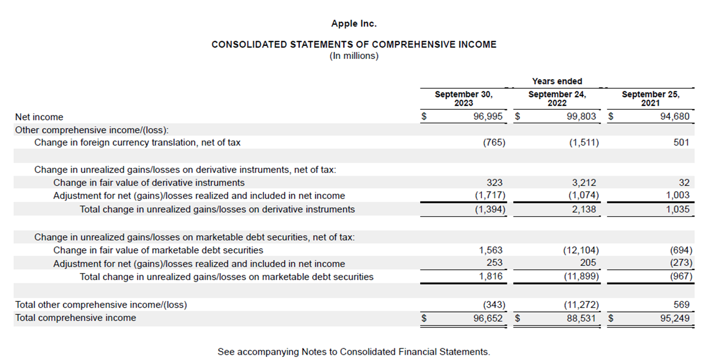 Other comprehensive income/loss에서는 실현되지 않은 손익만을 나타내므로 실현되어 이미 Net income에 포함된 부분은 빼줘야 한다. 이익으로 잡힌 부분은 빼고(재무제표에서 괄호는 마이너스를 의미), 손실로 잡힌 부분은 더해준다.