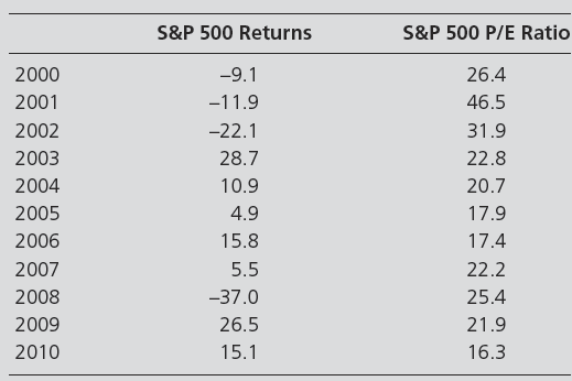 하지만 Index investor는 과잉 지불의 위험이 있다. 2000년~2010년의 매년 말 기준 PER과 S&P 500의 배당을 포함한 수익률이 다음 표에 제시되어 있다. Index investor들은 1990년도 후반 호황일 때에는 성과가 좋았다. 1997년부터 1999년까지 3년 동안 각각 33%, 28.6%, 21%를 기록하였다.