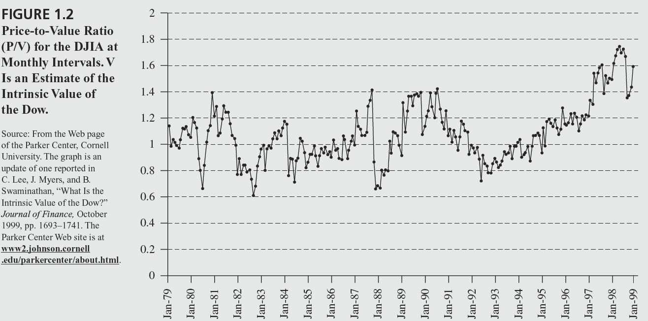 아래의 그림은 1979년부터 1999년까지 다우존스산업지수의 주가가치비율(price value ratio, PVR)이다. PVR은 시장가격(P)과 추정내재가치(V)의 관계이다.