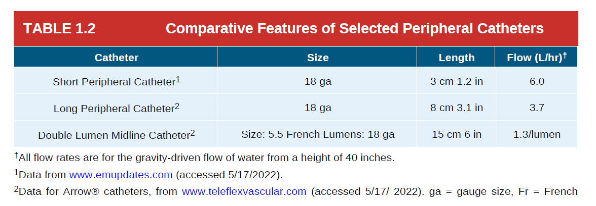 예를 들어, 표 1.3의 PICC는 표 1.2의 미드라인 카테터보다 길이가 3배 이상이며, 그 결과 유속 용량은 미드라인의 약 20% 수준에 불과하다.