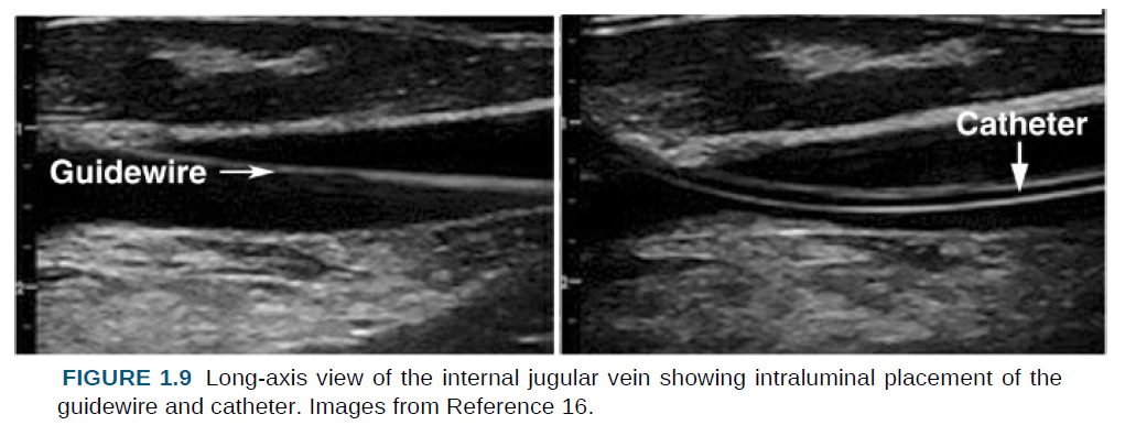 목표 정맥을 천자하기 위해 탐침 바늘을 전진시키는 과정은, 그림 1.6에서 보이는 바와 같이 장축 보기에서 쉽게 시각화된다.