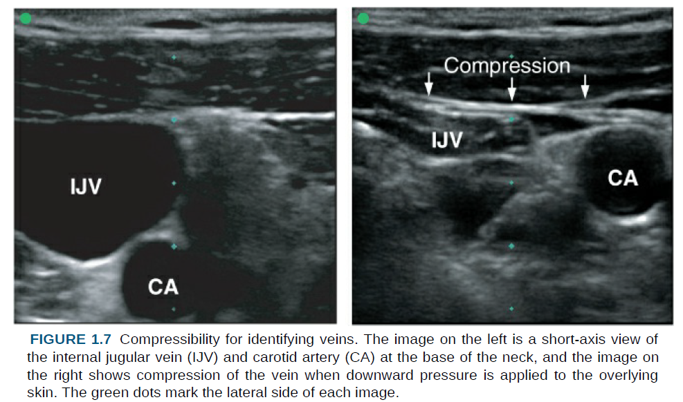 이는 그림 1.7에 잘 나타나 있는데, 피부를 눌러 내경정맥(internal jugular vein) 이 압박되어 납작해지는 반면, 인접한 경동맥(carotid artery) 은 영향을 받지 않는다.
