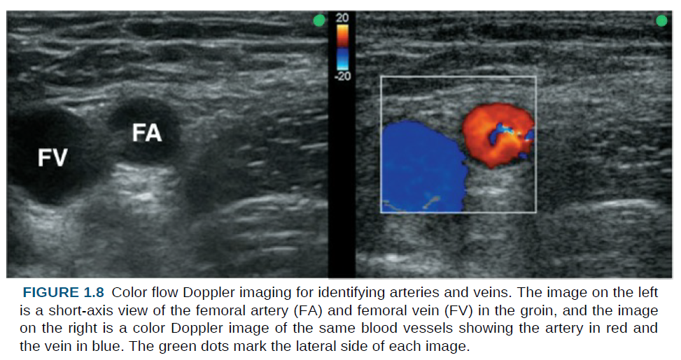 다만 이러한 색은 동맥과 정맥에 고유한 색이 아니라, 초음파 프로브에 대한 혈류의 방향을 나타낸다(색의 의미는 그림 1.8의 범례(color legend)에 표시되어 있다).