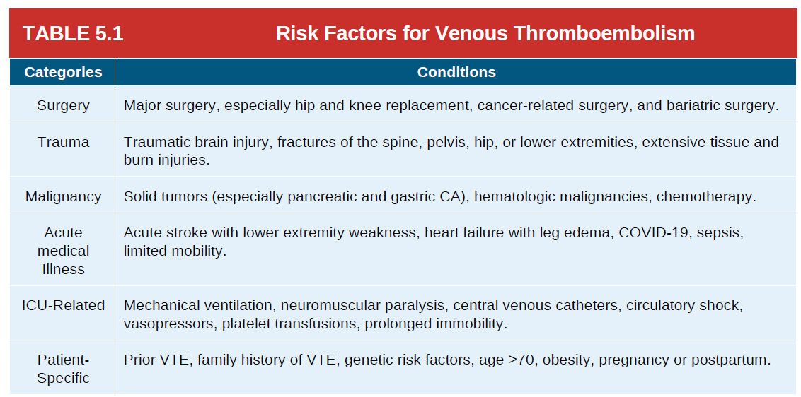 앞서 언급했듯이, ICU 환자의 대다수는 표 5.1에 나열된 VTE 위험 인자 중 하나 이상을 가지고 있다.