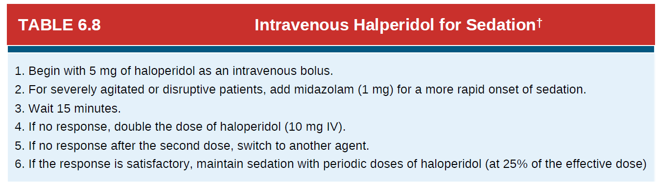 이 절에서는 이들 중 정맥 투여가 가능한 유일한 항정신병 약물이며, 입원 환자의 초조 및 섬망 치료에 오랜 사용 경험을 가진 haloperidol에 초점을 맞춘다.