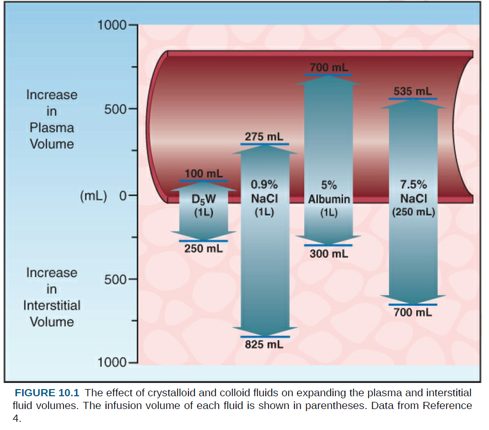 모든 결정질 수액은 부종 형성을 촉진하는 경향이 있지만, 0.9% saline은 나트륨 함량이 더 높기 때문에 그 경향이 더 클 수 있다(Figure 10.1).