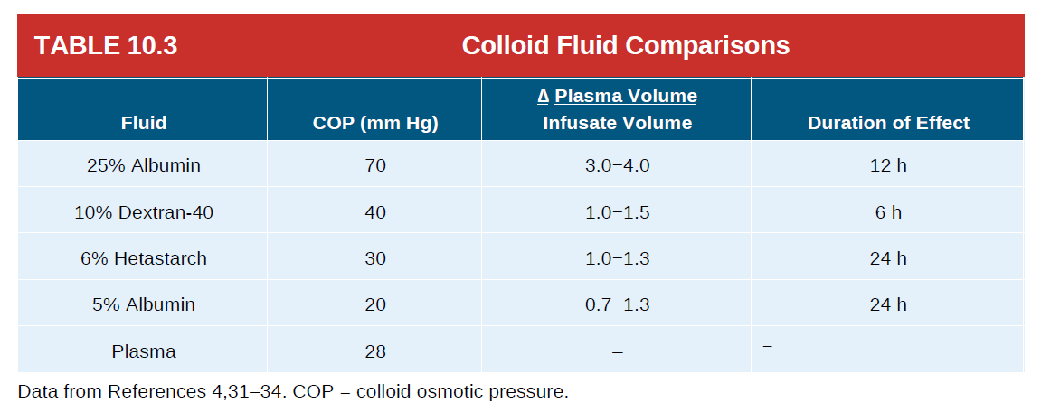 이는 Table 10.3에 잘 나타나 있으며, 이 표는 흔히 사용되는 교질 수액들의 COP와 혈장 용적 확장 효능을 비교한다.