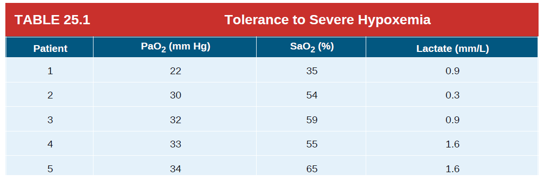 Table 25.1의 자료는, 최소 1시간 이상 실온 공기를 흡입하면서 PaO₂가 40 mm Hg 미만이었던 COPD 급성 악화 환자 8명을 대상으로 한 연구에서 나온 것이다.