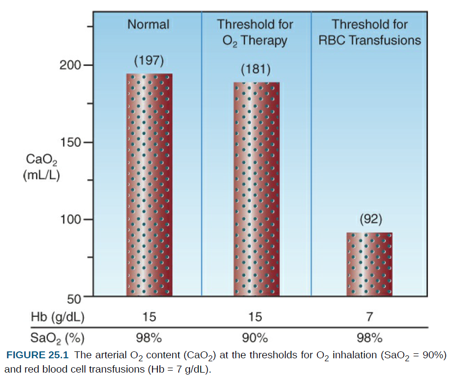 이는 Figure 25.1에서 잘 나타나는데, 이 그림은 조직 산소화를 증가시키기 위한 두 가지 개입, 즉 산소 흡입과 적혈구(RBC) 수혈의 기준치에서의 동맥혈 산소 함량(CaO₂)을 보여준다.
