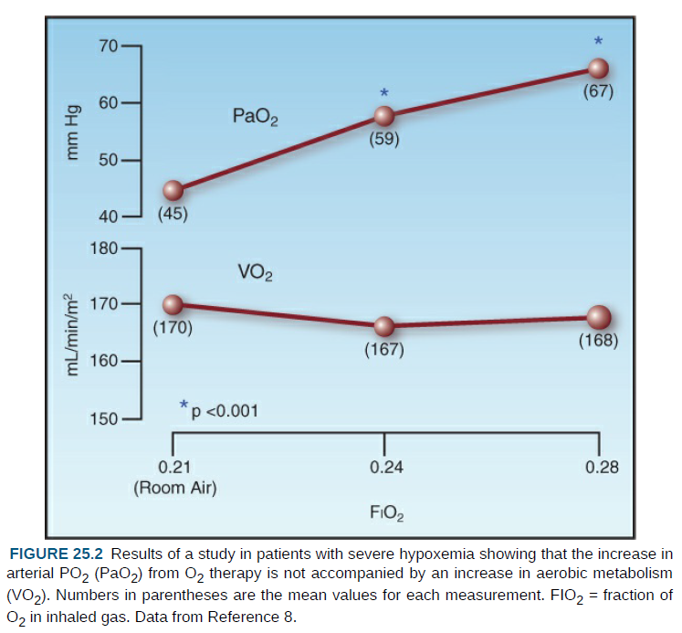 이는 Figure 25.2에서 잘 보이는데, 이 그림은 만성 폐쇄성 폐질환(COPD) 급성 악화 환자에서 24% 및 28% 산소를 흡입했을 때의 동맥혈 PO₂(PaO₂)와 호기성 대사율(VO₂)의 변화를 나타낸 것이다.