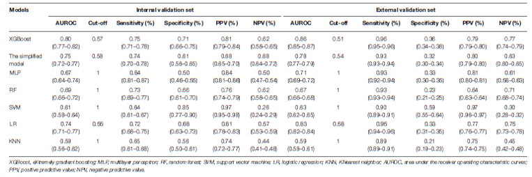 Model 들의 prediction efficiency는 receiver operating characterist(ROC) curve로 비교하였고, linear relationship through local weighted regression scatter smoothing (LOWESS)를 나타내는 SHAP value를 확인하였다.
