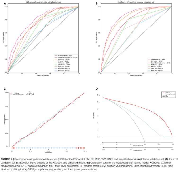 Invasive mechanical ventilation을 시행한 sepsis 환자는 MIMIC-IV에서 5,020명, eICU-CRD에서 7,081명이었으며, matching 후에 weaning이 28-day mortality와 ICU 재원 기간과 연관이 있다는 것을 확인할 수 있었다(p < 0.001 and p = 0.002, respectively). 이후 Weaning model을 설계하기 위해 35개의 임상 변수를 이용하였으며, internal validation과 external validation을 가장 잘 수행할 수 있는 model이 XGBoost임을 확인하였다(AUROC: 0.80 and 0.86, respectively). 마지막으로 XGBoost에 기반하여 오직 4개의 변수만을 포함하는 simplified model을 구성하였다. 이 simplified model은 good predictive performance를 보였으며 (AUROC:0.75 and 0.78 in internal and external validation sets, respectively), web-based tool로써 향후 review를 하는데 이용할 수 있다.